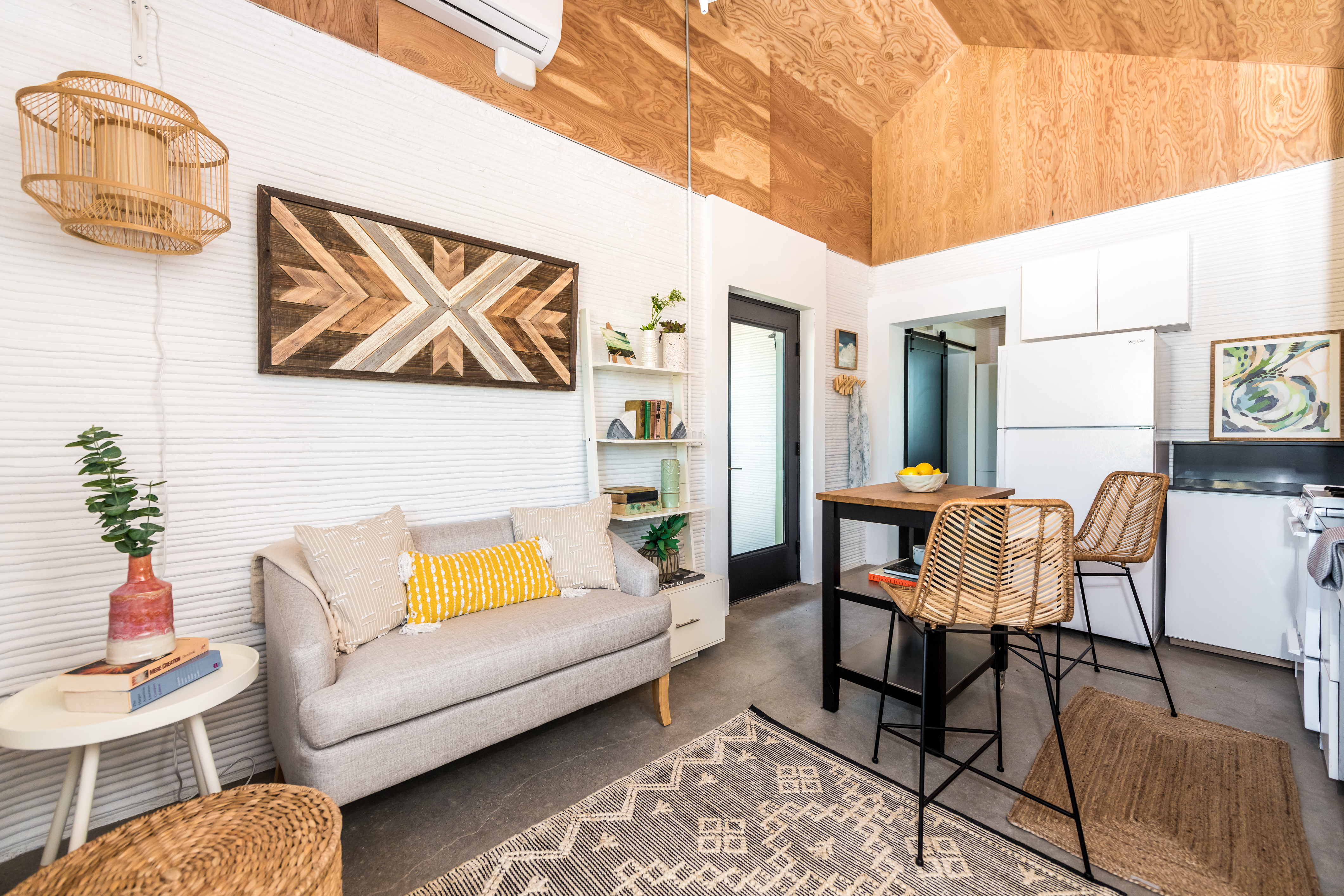 House Zero has three bedrooms with two and a half baths, along with a one bed and bath accessory dwelling unit. While the exterior walls are composed of the soft lines of the Lavacrete, many of the interior walls, ceiling, and rafters are made of wood.