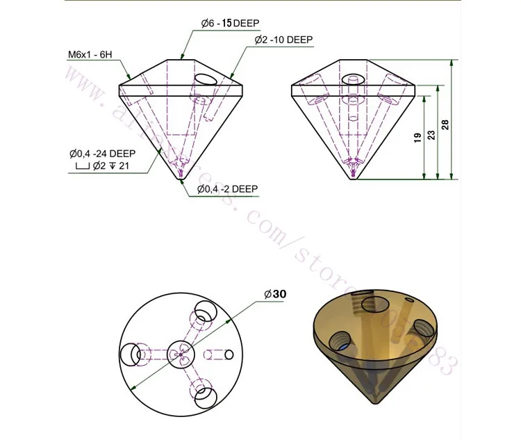 The 3D printer nozzle is a special nozzle located in the extruder heater block. It is screwed into place by means of a thread. There is a small chamber inside the nozzle where molten plastic accumulates and is squeezed out through the hole. Moreover, the key parameters of the nozzle will be: the material from which the nozzle is made and the diameter of the hole.