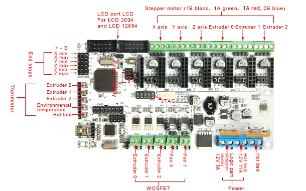 The Rumba 8-bit motherboard allows the 3D printer to use three extruders at the same time. However, installing them separately will not work, but you can only install a Diamond Hotend multi-extruder with support for three filaments.