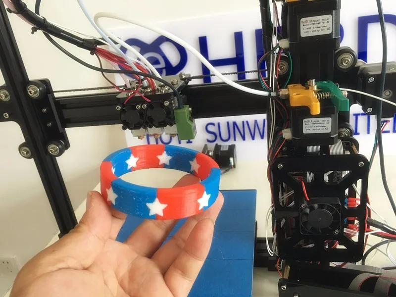 There are several dual filament printing options, ranging from Y-extruders to multiple independent printheads. When printing alternately one of the two heads, heated plastic can seep out of the unused one - you need to take into account retracts, “cleaning” before changing plastics (an additional separate “service” model is built nearby), calibration and alignment of the heads along the same coordinates. Color models must be loaded into the slicer separately, assigning a different model to each extruder. And if you still need color printing for work or your own project, then it makes sense to choose one of the proven models. For example, the JGMAKER Artist D 3D printer, which has two movable and independent print heads at once, each of which can be filled with a separate spool of plastic. This makes it possible not only to print color models, but also to create two separate models on the table at the same time, and it will also be convenient for printing soluble supports.